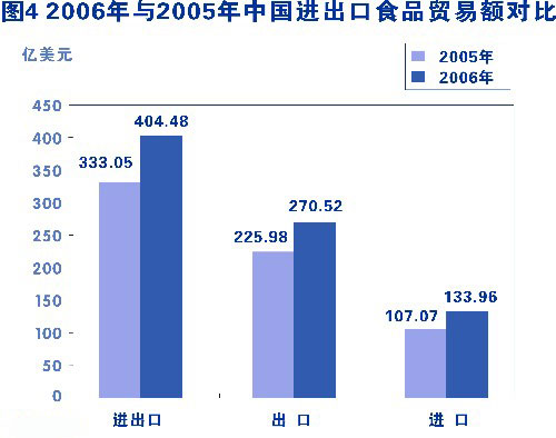 中国是食品进出口大国,多年来食品进出口不断增长。2006年,食品进出口贸易总额为404.48亿美元(不包括小麦、玉米、大豆等农产品,下同),同比增长了21.45%(见图4)。