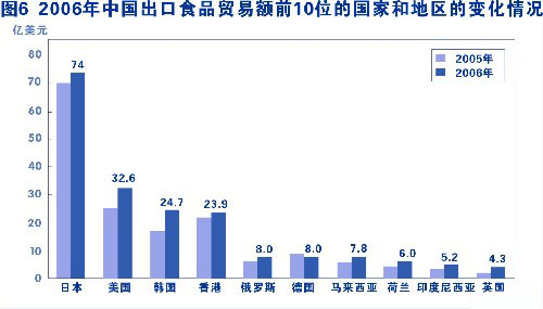 中国食品出口到200多个国家和地区,按贸易额排序前10位的国家和地区依次是:日本、美国、韩国、香港、俄罗斯、德国、马来西亚、荷兰、印度尼西亚、英国(见图6)。