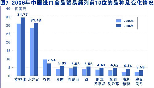 2006年,中国进口食品2027.3万吨,货值133.96亿美元,同比分别增长了7.94%和25.11%。进口食品货值列前10位的品种分别是:植物油、水产品、谷物、食糖、乳制品、酒、烟草及制品、禽肉及杂碎、油料作物、粮食制品(见图7)。