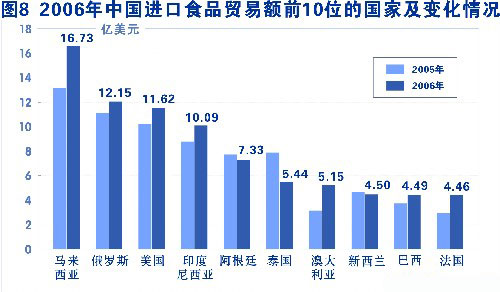 中国的进口食品来自世界上143个国家和地区,向中国出口食品货值列前10位的国家分别为:马来西亚、俄罗斯、美国、印度尼西亚、阿根廷、泰国、澳大利亚、新西兰、巴西、法国(见图8)。