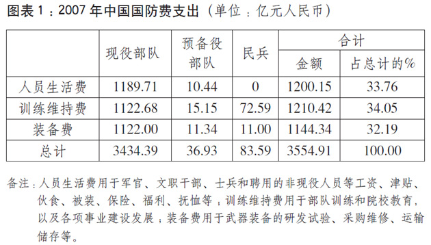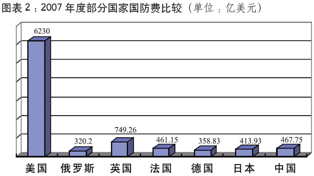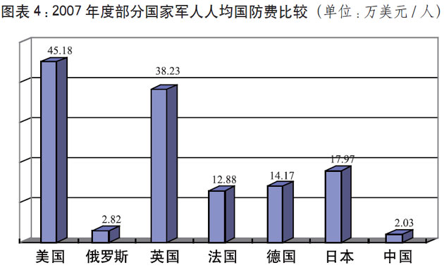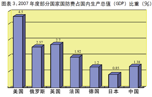 中国国防费总额、军人人均数额,仍低于世界一些主要大国的水平。2007年,中国年度国防费相当于美国的7.51%、英国的62.43%。军人人均数额是美国的4.49%,日本的11.3%,英国的5.31%,法国的15.76%,德国的14.33%。从国家国防负担的相对比例看,中国国防费仅占国内生产总值的1.38%,而美国占4.5%,英国占2.7%,法国占1.92%。