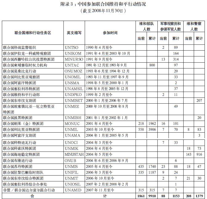 中国作为联合国安理会常任理事国,一贯支持并积极参与符合《联合国宪章》精神的维和行动。人民解放军自1990年以来共参加18项联合国维和行动,累计派出维和官兵11063人次,有8名维和官兵在执行任务中牺牲。截至2008年11月底,中国有1949名维和官兵在联合国9个维和任务区和联合国维和部执行任务。其中,军事观察员和参谋军官88人;赴联合国刚果(金)特派团工兵分队175人,医疗分队43人;赴联合国利比里亚特派团工兵分队275人,运输分队240人,医疗分队43人;赴联合国苏丹特派团工兵分队275人,运输分队100人,医疗分队60人;赴联合国驻黎巴嫩临时部队工兵分队275人,医疗分队60人;赴非盟/联合国达尔富尔混合行动工兵分队315人。2000年以来,中国向7个任务区派遣维和警察1379人次。目前,中国有208名维和警察在利比里亚、科索沃、海地、苏丹和东帝汶执行维和任务。