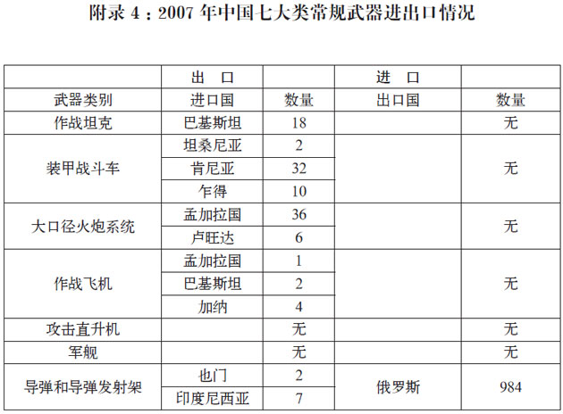 附录4:2007年中国七大类常规武器进出口情况