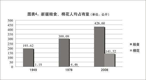 城乡居民的消费总量不断提高。人均粮食占有量从1949年的195.62公斤、1978年的300.09公斤,增长到2008年的426.60公斤;人均棉花占有量由1949年的1.18公斤、1978年的4.46公斤,增长到2008年的141.52公斤;人均肉类占有量由1949年的11.68公斤、1978年的7.83公斤,增长到2008年的53.85公斤。