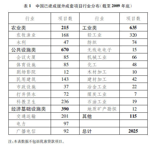 截至2009年底,中国共帮助发展中国家建成2000多个与当地民众生产和生活息息相关的各类成套项目,涉及工业、农业、文教、卫生、通讯、电力、能源、交通等多个领域。