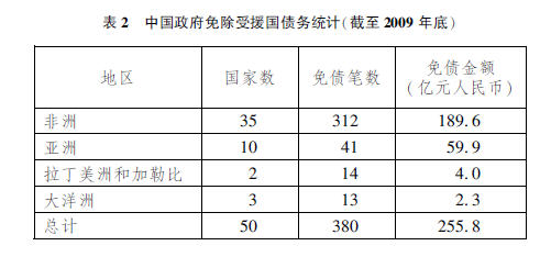 债务减免是指中国免除部分发展中国家对华到期政府债务。对于受援国对华政府债务,中国政府从不施加还款压力。在受援国偿还到期无息贷款遇到困难时,中国政府一向采取灵活的处理方式,通过双边协商延长还款期限。为进一步减轻经济困难国家的债务负担,中国政府在2000年中非合作论坛第一届部长级会议、2005年联合国发展筹资高级别会议、2006年中非合作论坛北京峰会、2008年联合国千年发展目标高级别会议、2009年中非合作论坛第四届部长级会议和2010年联合国千年发展目标高级别会议上,先后6次宣布免除与中国有外交关系的重债穷国和最不发达国家对华到期无息贷款债务。截至2009年底,中国与非洲、亚洲、拉丁美洲、加勒比和大洋洲50个国家签署免债议定书,免除到期债务380笔,金额达255.8亿元人民币。