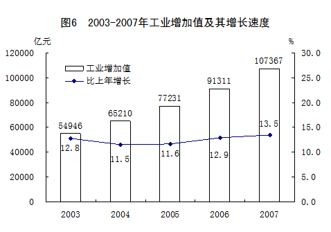 全年全部工业增加值107367亿元,比上年增长13.5%。规模以上工业增加值增长18.5%,其中国有及国有控股企业增长13.8%;集体企业增长11.5%,股份制企业增长20.6%,外商及港澳台投资企业增长17.5%;私营企业增长26.7%。分轻重工业看,轻工业增长16.3%,重工业增长19.6%。