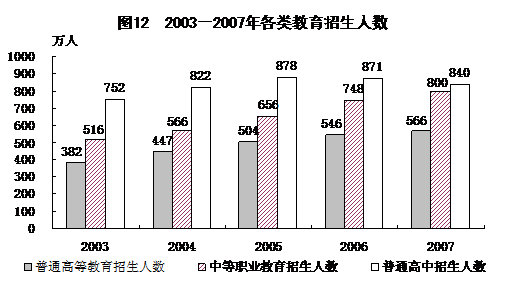 全年研究生教育招生42万人,在学研究生120万人,毕业生31万人。普通高等教育招生566万人,在校生1885万人,毕业生448万人。各类中等职业教育招生800万人,在校生2000万人,毕业生530万人。全国普通高中招生840万人,在校生2522万人,毕业生788万人。全国初中招生1869万人,在校生5736万人,毕业生1964万人。普通小学招生1736万人,在校生10564万人,毕业生1870万人。特殊教育招生6万人,在校生41万人。幼儿园在园幼儿2349万人。