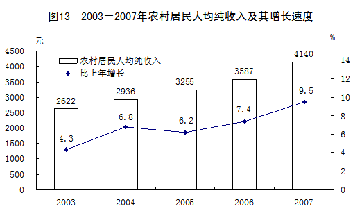 全年农村居民人均纯收入4140元,扣除价格上涨因素,比上年实际增长9.5%;城镇居民人均可支配收入13786元,实际增长12.2%。农村居民家庭恩格尔系数(即居民家庭食品消费支出占家庭消费总支出的比重)为43.1%,城镇居民家庭恩格尔系数为36.3%。按农村绝对贫困人口标准低于785元测算,年末农村贫困人口为1479万人,比上年末减少669万人;按低收入人口标准786-1067元测算,年末农村低收入人口为2841万人,减少709万人。