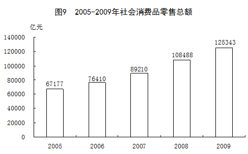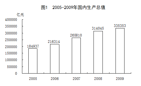 中华人民共和国 中华人民共和国国家统计局 2010年2月25日 2009年,全国各族人民在党中央、国务院的领导下,以邓小平理论和“三个代表”重要思想为指导,深入贯彻落实科学发展观,认真贯彻积极的财政政策和适度宽松的货币政策,全面落实应对国际金融危机的一揽子计划和政策措施,国民经济形势总体回升向好,各项社会事业取得新的进展。 一、综合 初步核算,全年国内生产总值335353亿元,比上年增长8.7%。分产业看,第一产业增加值35477亿元,增长4.2%;第二产业增加值156958亿元,增长9.5%;第三产业增加值142918亿元,增长8.9%。第一产业增加值占国内生产总值的比重为10.6%,比上年下降0.1个百分点;第二产业增加值比重为46.8%,下降0.7个百分点;第三产业增加值比重为42.6%,上升0.8个百分点。