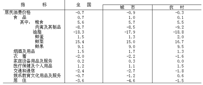 全年居民消费价格比上年下降0.7%,其中食品价格上涨0.7%。固定资产投资价格下降2.4%。工业品出厂价格下降5.4%,其中生产资料价格下降6.7%,生活资料价格下降1.2%。原材料、燃料、动力购进价格下降7.9%。农产品生产价格下降2.4%。农业生产资料价格下降2.5%。70个大中城市房屋销售价格上涨1.5%,其中新建住宅价格上涨1.3%,二手住宅价格上涨2.4%;房屋租赁价格下降0.6%。
