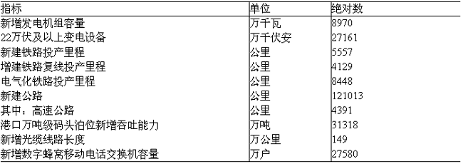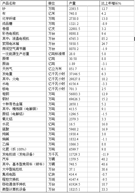 全年规模以上工业中,煤炭开采和洗选业增加值比上年增长8.3%;石油和天然气开采业增长4.8%;农副食品加工业增长15.9%;纺织业增长8.5%;通用设备制造业增长11.0%;专用设备制造业增长13.0%;交通运输设备制造业增长18.4%,其中汽车制造增长20.3%,船舶制造增长20.7%;通信设备、计算机及其他电子设备制造业增长5.3%;电气机械及器材制造业增长12.0%。6大高载能行业比上年增长10.6%,其中,非金属矿物制品业增长14.7%,化学原料及化学制品制造业增长14.6%,有色金属冶炼及压延加工业增长12.8%,黑色金属冶炼及压延加工业增长9.9%,电力、热力的生产和供应业增长6.0%,石油加工、炼焦及核燃料加工业增长5.2%。高技术制造业增加值比上年增长7.7%。 表2:2009年主要工业产品产量及其增长速度