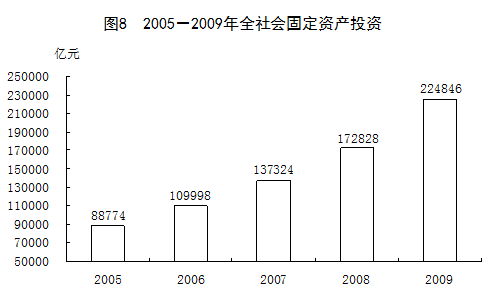 四、固定资产投资 全年全社会固定资产投资224846亿元,比上年增长30.1%。分城乡看,城镇投资194139亿元,增长30.5%;农村投资30707亿元,增长27.5%。分地区看,东部地区投资95653亿元,比上年增长23.0%;中部地区投资49846亿元,增长35.8%;西部地区投资49662亿元,增长38.1%;东北地区投资23733亿元,增长26.8%。
