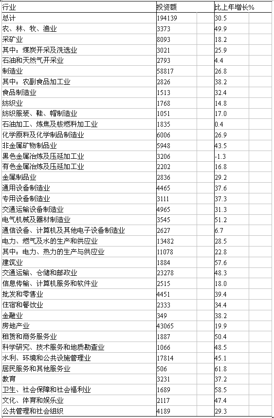 在城镇投资中,第一产业投资3373亿元,比上年增长49.9%;第二产业投资82277亿元,增长26.8%;第三产业投资108489亿元,增长33.0%。 表4:2009年分行业城镇固定资产投资及其增长速度 单位:亿元