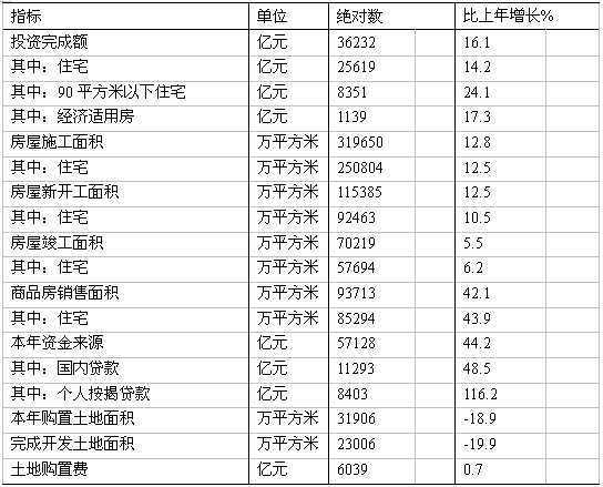 全年房地产开发投资36232亿元,比上年增长16.1%。其中,商品住宅投资25619亿元,增长14.2%;办公楼投资1378亿元,增长18.1%;商业营业用房投资4172亿元,增长24.4%。 表6:2009年房地产开发和销售主要指标完成情况
