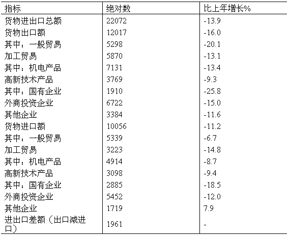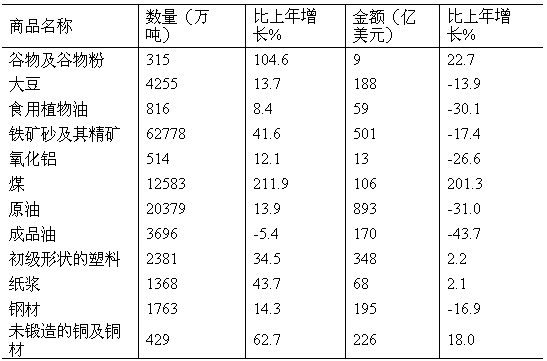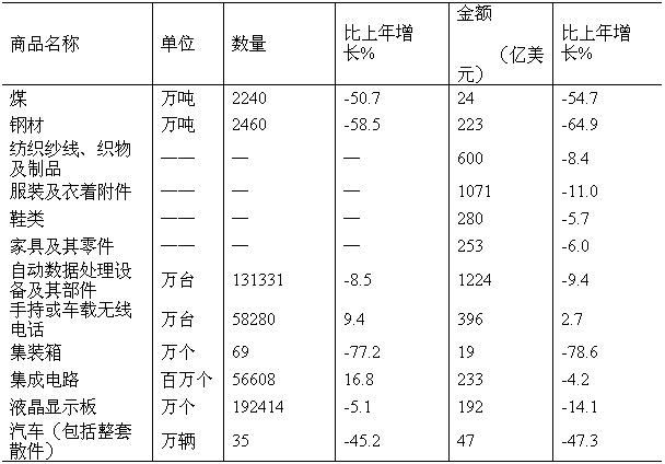 在限额以上批发和零售业零售额中,汽车类零售额比上年增长32.3%,粮油类增长13.0%,肉禽蛋类增长8.3%,服装类增长20.8%,日用品类增长15.6%,文化办公用品类增长6.7%,通讯器材类下降1.3%,化妆品类增长16.9%,金银珠宝类增长15.9%,中西药品类增长21.7%,家用电器和音像器材类增长12.3%,家具类增长35.5%,建筑及装潢材料类增长26.6%。 六、对外经济 全年货物进出口总额22072亿美元,比上年下降13.9%。其中,货物出口12017亿美元,下降16.0%;货物进口10056亿美元,下降11.2%。进出口差额(出口减进口)1961亿美元,比上年减少1020亿美元。 表7:2009年货物进出口总额及其增长速度 单位:亿美元