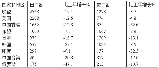 表10:2009年对主要国家和地区货物进出口额及其增长速度 单位:亿美元