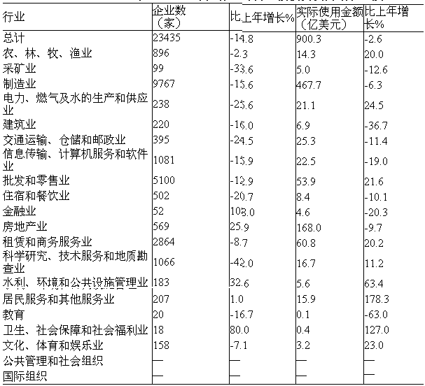 全年非金融领域新批外商直接投资企业23435家,比上年减少14.8%。实际使用外商直接投资金额900亿美元,下降2.6%。其中,制造业占52.0%;房地产业占18.7%;租赁和商务服务业占6.8%;批发和零售业占6.0%;交通运输、仓储和邮政业占2.8%。 表11:2009年分行业外商直接投资及其增长速度