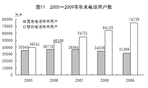 全年规模以上港口完成货物吞吐量69.1亿吨,比上年增长8.2%,其中外贸货物吞吐量21.4亿吨,增长8.6%。港口集装箱吞吐量12082万标准箱,下降5.8%。 年末全国民用汽车保有量达到7619万辆(包括三轮汽车和低速货车1331万辆),比上年末增长17.8%,其中私人汽车保有量5218万辆,增长25.0%。民用轿车保有量3136万辆,增长28.6%,其中私人轿车2605万辆,增长33.8%。 全年完成邮电业务总量27313亿元,比上年增长14.6%。其中,邮政业务总量1632亿元,增长16.4%;电信业务总量25681亿元,增长14.4%。全年局用交换机容量减少1644万门,总容量49219万门;新增移动电话交换机容量27580万户,达到142111万户。固定电话年末用户31369万户。其中,城市电话用户21178万户,农村电话用户10191万户。新增移动电话用户10614万户,年末达到74738万户。年末全国固定及移动电话用户总数达到106107万户,比上年末增加7947万户。电话普及率达到79.9部/百人。互联网上网人数3.8亿人,其中宽带上网人数3.5亿人;互联网普及率达到28.9%。