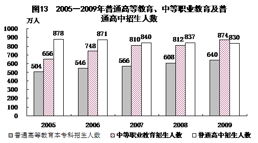 全年农村金融合作机构(农村信用社、农村合作银行、农村商业银行)人民币贷款余额4.7万亿元,比年初增加9727亿元。全部金融机构人民币消费贷款余额5.5万亿元,增加17976亿元。其中,个人短期消费贷款余额0.6万亿元,增加2465亿元;个人中长期消费贷款余额4.9万亿元,增加15511亿元。 全年上市公司通过境内市场累计筹资3653亿元,比上年增加1255亿元。其中,首次公开发行A股99只,筹资2062亿元,增加995亿元;A股再筹资(包括配股、公开增发、非公开增发、认股权证)筹资1591亿元,增加259亿元;上市公司通过发行可转债、可分离债、公司债筹资813亿元,减少185亿元。全年首次公开发行创业板股票36只,筹资204亿元。 全年发行非上市公司企业(公司)债券4252亿元,比上年增加1885亿元。企业发行短期融资券4612亿元,增加281亿元;中期票据6987亿元,增加5250亿元。发行中小企业集合票据12.7亿元。 全年保险公司原保险保费收入11137亿元,比上年增长13.8%,其中寿险业务原保险保费收入7457亿元;健康险和意外伤害险业务原保险保费收入804亿元;财产险业务原保险保费收入2876亿元。支付各类赔款及给付3125亿元,其中寿险业务给付1269亿元;健康险和意外伤害险赔款及给付281亿元;财产险业务赔款1576亿元。 九、教育和科学技术 全年研究生教育招生51.1万人,在学研究生140.5万人,毕业生37.1万人。普通高等教育本专科招生639.5万人,在校生2144.7万人,毕业生531.1万人。各类中等职业教育招生873.6万人,在校生2178.7万人,毕业生619.2万人。全国普通高中招生830.3万人,在校生2434.3万人,毕业生823.7万人。全国初中招生1788.5万人,在校生5440.9万人,毕业生1797.7万人。普通小学招生1637.8万人,在校生10071.5万人,毕业生1805.2万人。特殊教育招生6.4万人,在校生42.8万人。幼儿园在园幼儿2657.8万人。
