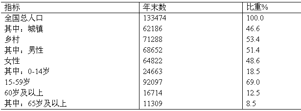 全年研究与试验发展(R&D)经费支出5433亿元,比上年增长17.7%,占国内生产总值的1.62%,其中基础研究经费272亿元。全年国家安排了639项科技支撑计划课题,1328项“863”计划课题。累计建设国家工程研究中心127个,国家工程实验室85个。国家认定企业技术中心达到636家。省级企业技术中心达到5011家。启动实施新兴产业创投计划,支持设立20家创业投资基金。全年受理国内外专利申请97.7万件,其中国内申请87.8万件,占89.9%。受理国内外发明专利申请31.5万件,其中国内申请22.9万件,占72.8%。全年授予专利权58.2万件,其中国内授权50.2万件,占86.2%。授予发明专利权12.8万件,其中国内授权6.5万件,占50.9%。截至2009年底,有效专利152.0万件,其中国内有效专利119.3万件,占78.5%;有效发明专利43.8万件,其中国内有效发明专利18.0万件,占41.1%。全年共签订技术合同21.4万项,技术合同成交金额3039亿元,比上年增长14.0%。全年成功发射卫星6次。首台千万亿次超级计算机系统“天河一号”研制成功;嫦娥一号卫星成功受控撞月。 年末全国共有产品检测实验室25000个,其中国家检测中心414个。全国现有产品质量、体系认证机构168个,已累计完成对4.1万个企业的产品认证。全国共有法定计量技术机构3760个,全年强制检定计量器具4560万台(件)。全年制定、修订国家标准3158项,其中新制定2102项。全年中央气象台和省级气象台共发布气象预警信号2737次,警报3950次。全国共有地震台站1457个,地震遥测台网32个。全国共有海洋观测站66个。测绘部门公开出版地图2060种,测绘图书307种。 十、文化、卫生和体育 年末全国共有艺术表演团体2478个,文化馆3214个,公共图书馆2833个,博物馆1996个。广播电台251座,电视台272座,广播电视台2087座,教育台44个。有线电视用户17398万户,有线数字电视用户6200万户。年末广播节目综合人口覆盖率为96.3%;电视节目综合人口覆盖率为97.2%。全年生产故事影片456部,科教、纪录、动画和特种影片102部。出版各类报纸437亿份,各类期刊31亿册,图书70亿册(张)。年末全国共有档案馆4035个,已开放各类档案7991万卷(件)。 年末全国共有卫生机构28.9万个,其中医院、卫生院6.0万个,社区卫生服务中心(站)2.6万个,妇幼保健院(所、站)3013个,专科疾病防治院(所、站)1315个,疾病预防控制中心(防疫站)3543个,卫生监督所(中心)2706个,诊所及其他19.3万个。卫生技术人员522万人,其中执业医师和执业助理医师216万人,注册护士174万人。医院和卫生院床位396万张。乡镇卫生院3.9万个,床位91万张,卫生技术人员89.8万人。全年甲、乙类法定报告传染病发病人数377.6万例,报告死亡15105人;报告传染病发病率284.34/10万,死亡率1.14/10万。 全年运动健儿在30个项目中共获得142个世界冠军,11人3队22次创22项世界纪录。在第十一届全国运动会上,共有7人9次创超5项世界纪录;12人3队21次创16项亚洲纪录;29人5队52次创39项全国纪录。 十一、人口、人民生活和社会保障 年末全国总人口为133474万人,比上年末增加672万人。全年出生人口1615万人,出生率为12.13‰;死亡人口943万人,死亡率为7.08‰;自然增长率为5.05‰。出生人口性别比为119.45。 表15:2009年人口数及其构成 单位:万人