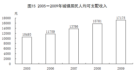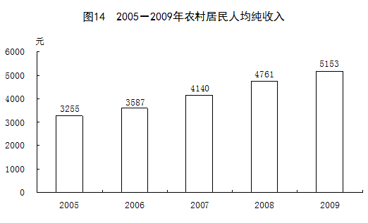 全年农村居民人均纯收入5153元,剔除价格因素,比上年实际增长8.5%;城镇居民人均可支配收入17175元,实际增长9.8%。农村居民家庭食品消费支出占消费总支出的比重为41.0%,城镇为36.5%。按2009年农村贫困标准1196元测算,年末农村贫困人口为3597万人。