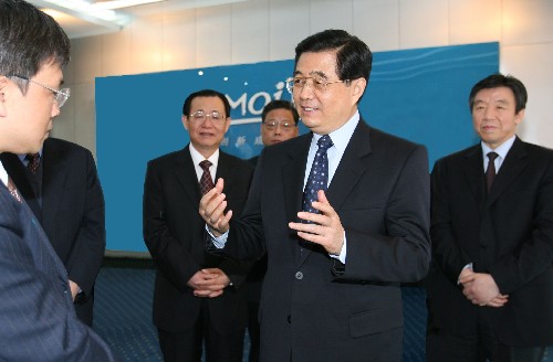1月12日至16日,中共中央总书记、国家主席、中央军委主席胡锦涛在福建省考察工作。这是胡锦涛在厦门夏新电子股份有限公司了解企业生产经营和自主创新情况。 新华社记者 鞠鹏 摄