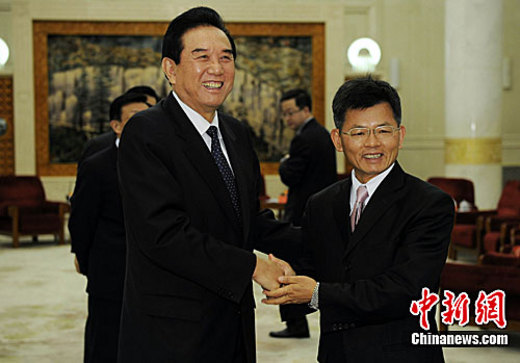 3月21日晚,海峡两岸关系协会会长陈云林在北京会见了来访的台湾无党籍知名人士、前高雄县县长杨秋兴一行。中新社发 刘震 摄