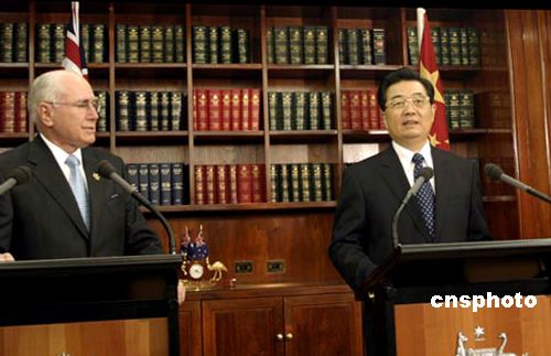 2007年9月6日,中国国家主席胡锦涛在悉尼与澳大利亚总理霍华德参加签字仪式后共同会见记者。 中新社发 赖海隆 摄