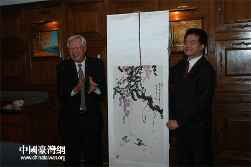 图:罗豪才(左)代表中国统促会向来访的全非洲统促会访问团赠送纪念品,右为访问团团长、全非洲统促会会长叶北洋先生。