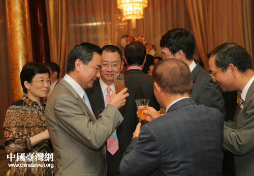 8月27日,中共中央台办、国务院台办主任王毅在钓鱼台国宾馆举行欢迎酒会,欢迎前来北京出席台商座谈会的台湾工商界人士和大陆台商代表。这是出席酒会的台湾工商界人士和大陆台商代表向王毅主任敬酒。