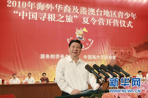 7月25日,中共中央政治局常委、国家副主席习近平在北京人民大会堂出席2010年海外华裔及港澳台地区青少年“中国寻根之旅”夏令营开营式并讲话,向营员代表颁授营旗。这是习近平向营员代表颁授营旗。新华社记者 谢环驰 摄
