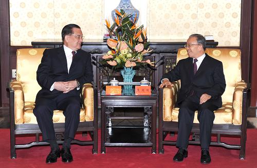 9月15日,国务委员戴秉国在北京钓鱼台国宾馆会见中国国民党荣誉主席连战。新华社记者 马占成 摄