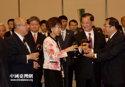 中国国民党荣誉主席连战(右二)、吴伯雄(左一)等200多位台湾嘉宾出席招待酒会。(中国台湾网 张弛 摄)