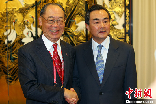 中共中央台办主任王毅2011年4月15日为前来出席博鳌亚洲论坛年会的台湾“两岸共同市场基金会”最高顾问钱复一行举行招待酒会。
