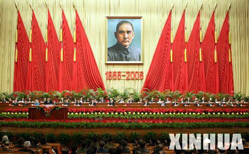 11月12日,孙中山先生诞辰140周年纪念大会在北京人民大会堂隆重举行。中共中央总书记、国家主席、中央军委主席胡锦涛在会上发表重要讲话。 新华社记者黄敬文摄