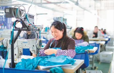 在黔东南苗族侗族自治州榕江县工业园区,搬迁群众在制作衣服。