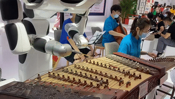在湖北馆,如果感觉疲惫,你可以驻足聆听智能机器人弹奏一曲扬琴,放松一下心情;