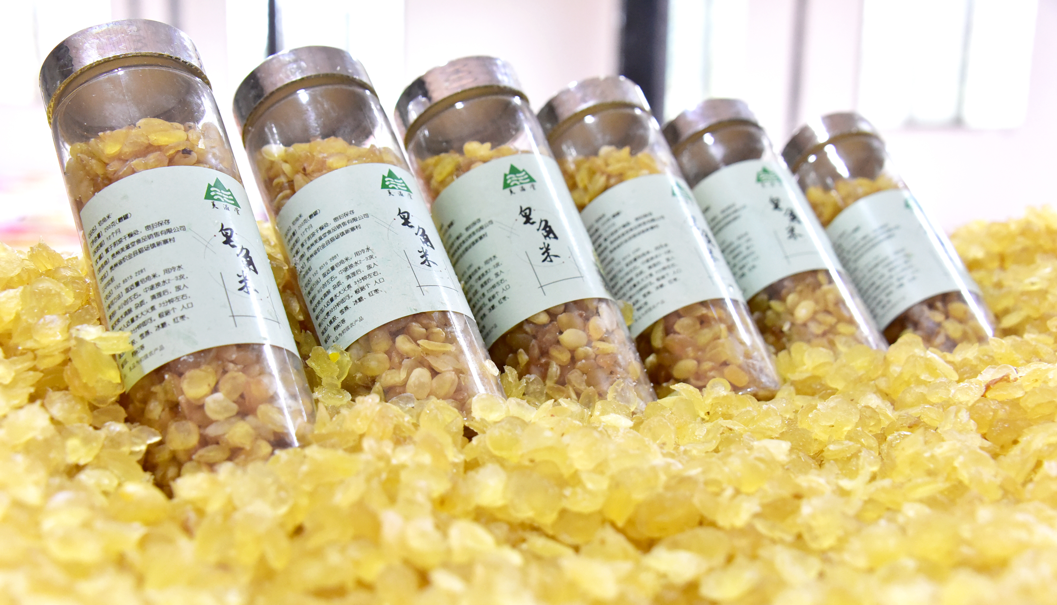 贵州美滋堂食品销售有限公司是猫场镇皂角产业园里一家皂角加工企业。走进生产车间,工人们有的在熟练地剥去皂角籽(也称皂角精)的皮,有的在分拣皂角米……黄橙橙的皂角米晶莹剔透、色泽诱人。