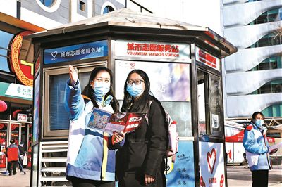蔺红霞(左)在西单图书大厦城市志愿者服务站点为市民指路