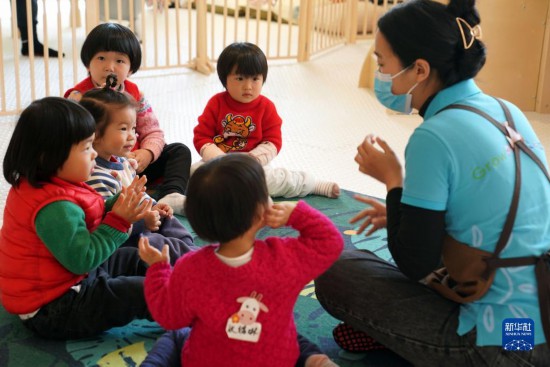 3月7日,在江宁路街道社区综合为老服务中心,“宝宝屋”的看护人员带领小朋友们玩游戏。