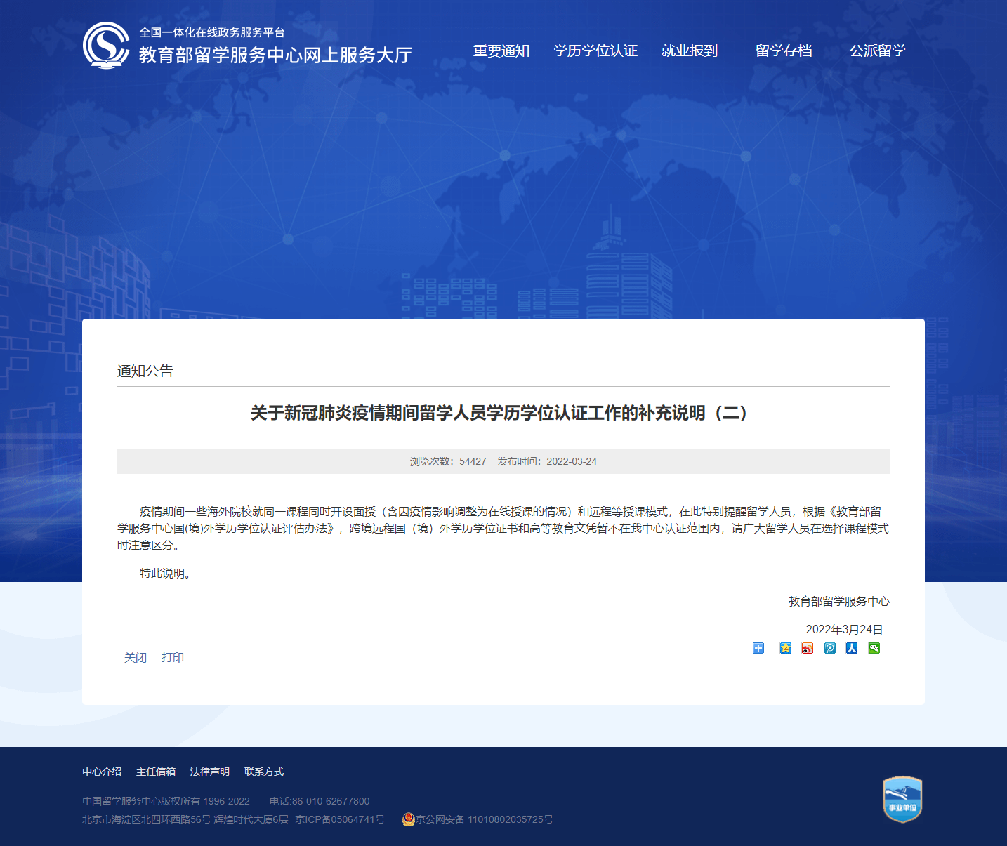 人民网北京3月25日电 (记者温璐、郝孟佳)今天,教育部留学服务中心发布了《关于新冠肺炎疫情期间留学人员学历学位认证工作的补充说明(二)》。