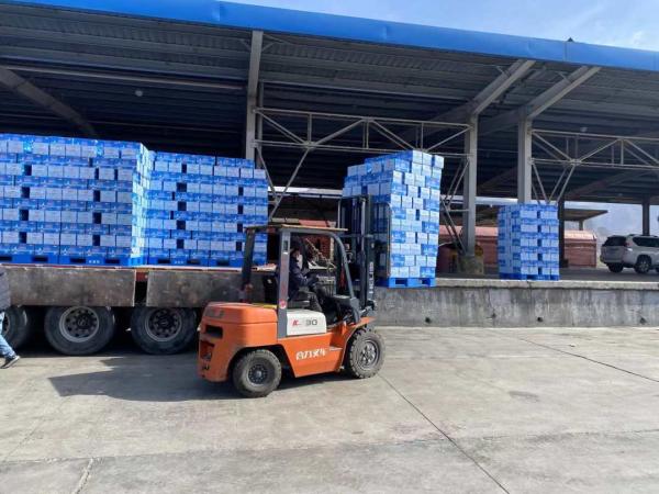 4月10日,一批援助物资在拉萨市西货站装车,即将运往上海市和吉林省等地。西藏自治区党委、政府心系两省市抗疫工作,决定向上海市、吉林省紧急支援部分抗疫生活物资,西藏将支援上海市 100 吨牦牛肉和 3000 吨天然饮用水,支援吉林省 5000 吨天然饮用水。