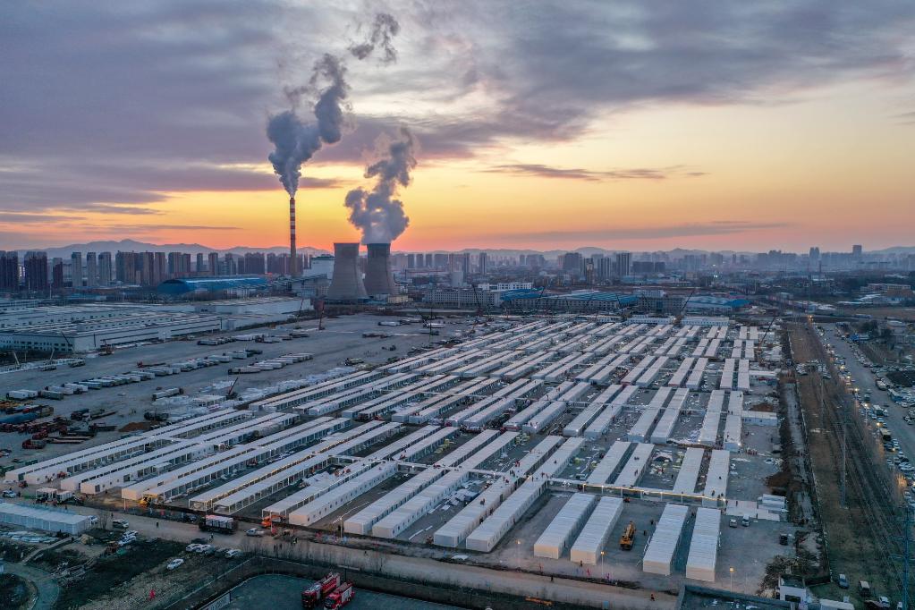 这是3月20日傍晚拍摄的吉林市高新南区隔离方舱建设现场(无人机照片)。新华社记者 张楠 摄