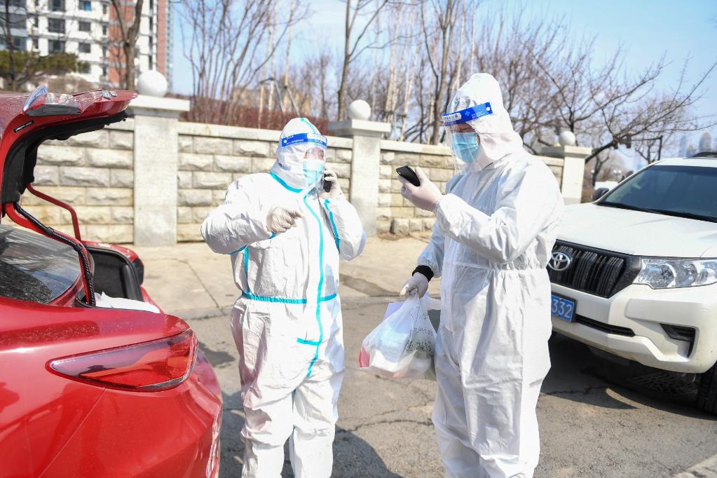 3月21日,在吉林市一小区卡口,志愿者张锐(右)、陈斌打电话通知社区工作人员取货。新华社记者 张楠 摄