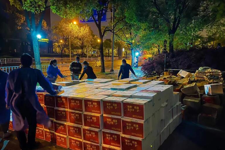 湖北省荆州市9000余份爱心援沪物资近日抵达上海。这批物资包含虾稻米、小胡鸭、八宝饭、牛肉酱和蔬菜包等品种。
