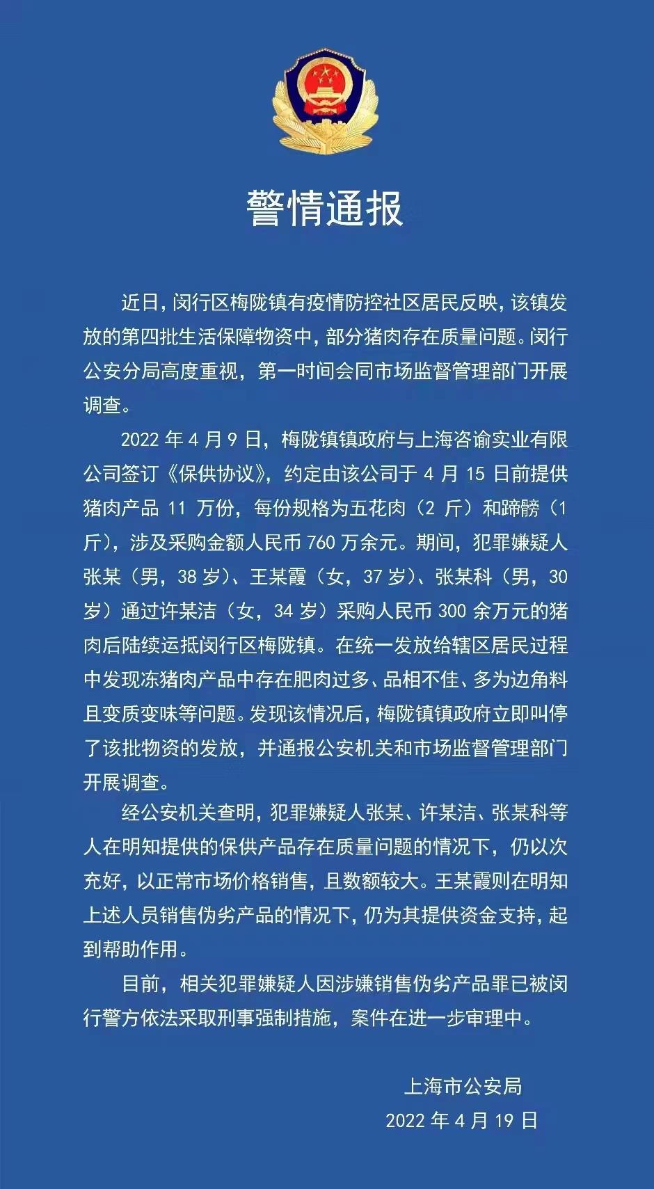 警方通报:2022年4月9日,梅陇镇镇政府与上海咨谕实业有限公司签订《保供协议》,约定由该公司于4月15日前提供猪肉产品11万份,每份规格为五花肉(2斤)和蹄髈(1斤),涉及采购金额人民币760万余元。其间,犯罪嫌疑人张某(男,38岁)、王某霞(女,37岁)、张某科(男,30岁)通过许某洁(女,34岁)采购人民币300余万元的猪肉后陆续运抵闵行区梅陇镇。在统一发放给辖区居民过程中发现冻猪肉产品中存在肥肉过多、品相不佳、多为边角料且变质变味等问题。发现该情况后,梅陇镇镇政府立即叫停了该批物资的发放,并通报公安机关和市场监督管理部门开展调查。