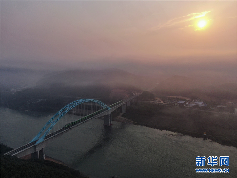 动车迎着朝阳行驶在位于云南省西双版纳傣族自治州境内的中老铁路橄榄坝澜沧江大桥上(4月11日摄,无人机照片)。