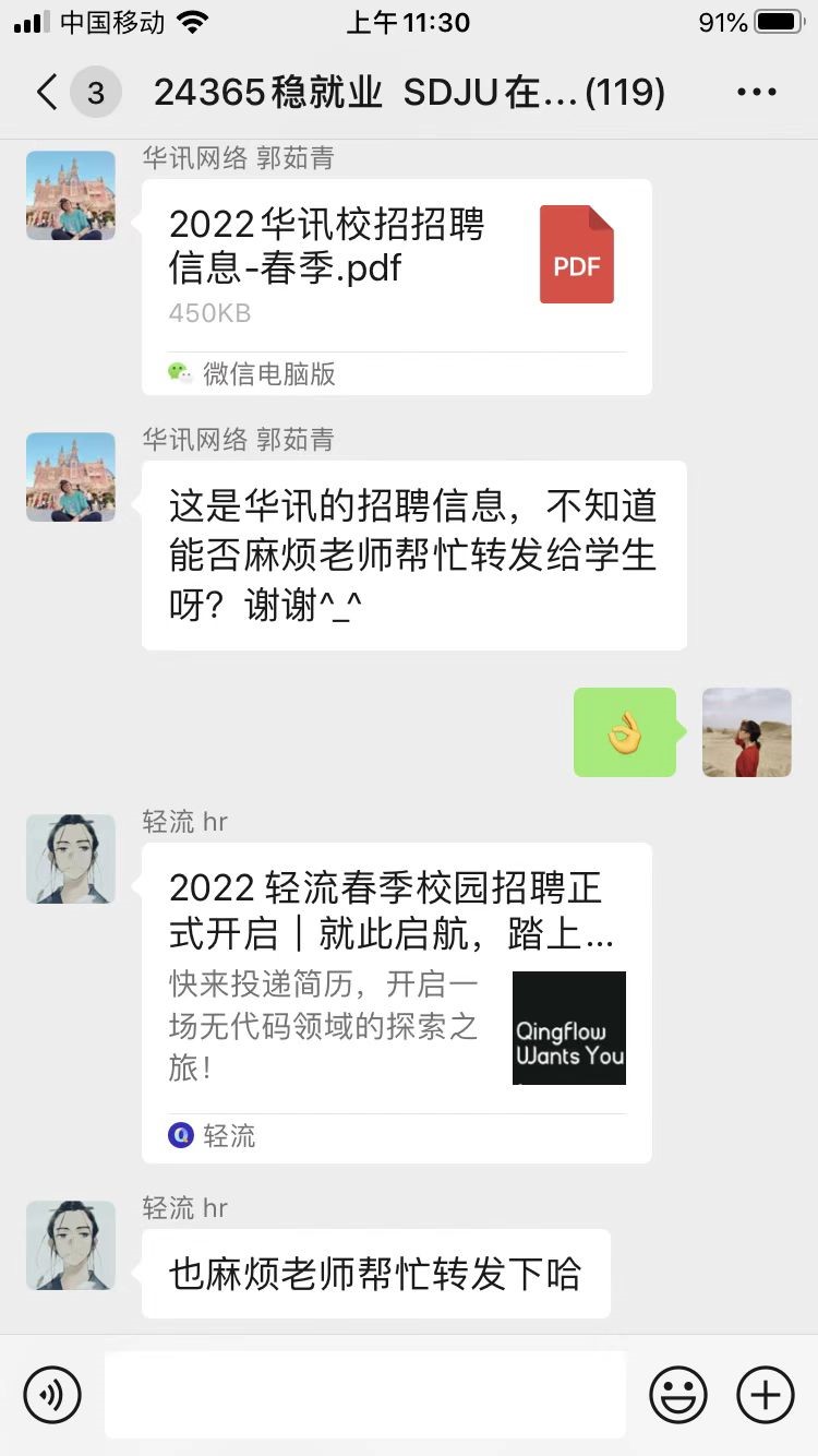 “请有招聘计划的单位以接龙方式提出招聘需求,学校将收集有意向的学生简历,发在此群。”4月8日,同济大学学生就业指导中心分别与中建集团、中交集团、上汽集团、东方电气集团等跟学校长期合作的重点单位建起了“简历直推微信群”,希望能面向今年仍有招聘计划的单位和尚未落实就业单位的同济毕业生进行精准匹配。