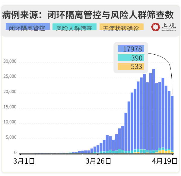 在4月19日新增的18901例患者中(含无症状与确诊病例),95.12%的患者在闭环隔离管控中被发现,2.06%的患者为风险人群筛查,而2.82%的患者为此前的无症状患者转为确诊病例。